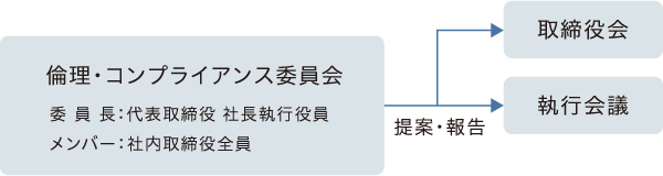 取締役会に直結した委員会として「倫理・コンプライアンス委員会」を設置しています。社長が委員長を務め、社内取締役が委員として当社グループにおける倫理観の向上・コンプライアンス意識の醸成を推進しています。内部通報制度を通じたモニタリング結果等を定期的に取締役会に報告しています。