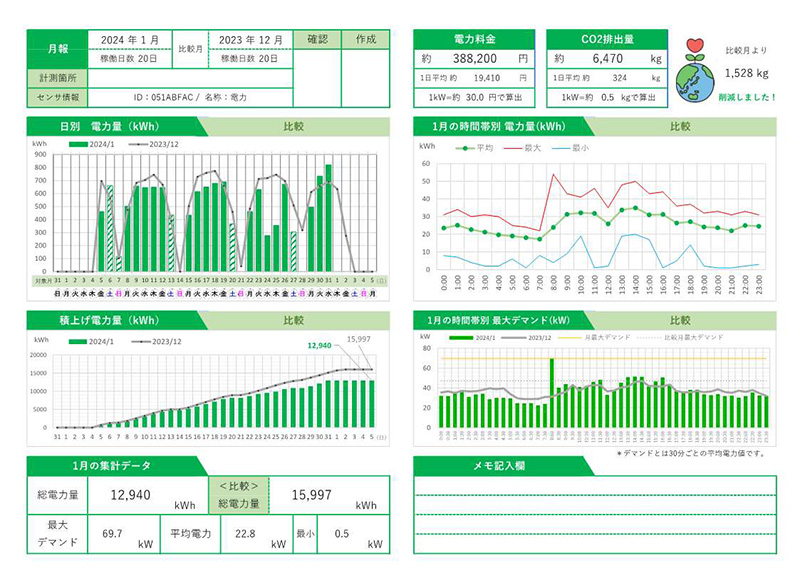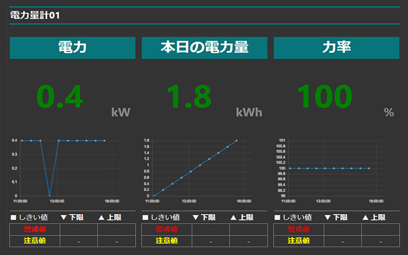 これまで把握できなかったライン全体の電力が、設備ごとのデータから簡単に把握できるようになります。さらに、生産状況と組み合わせれば、原単位あたりのCO2排出量を算出することも可能です。