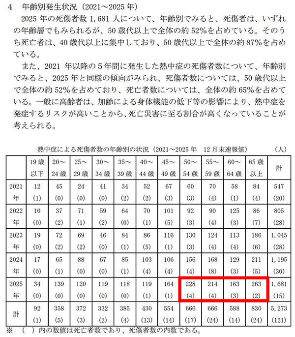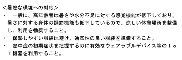 また、一般的に高年齢者は暑さ、水分不足に対する感覚機能が低下していることも念頭に置いた対策が必要です。